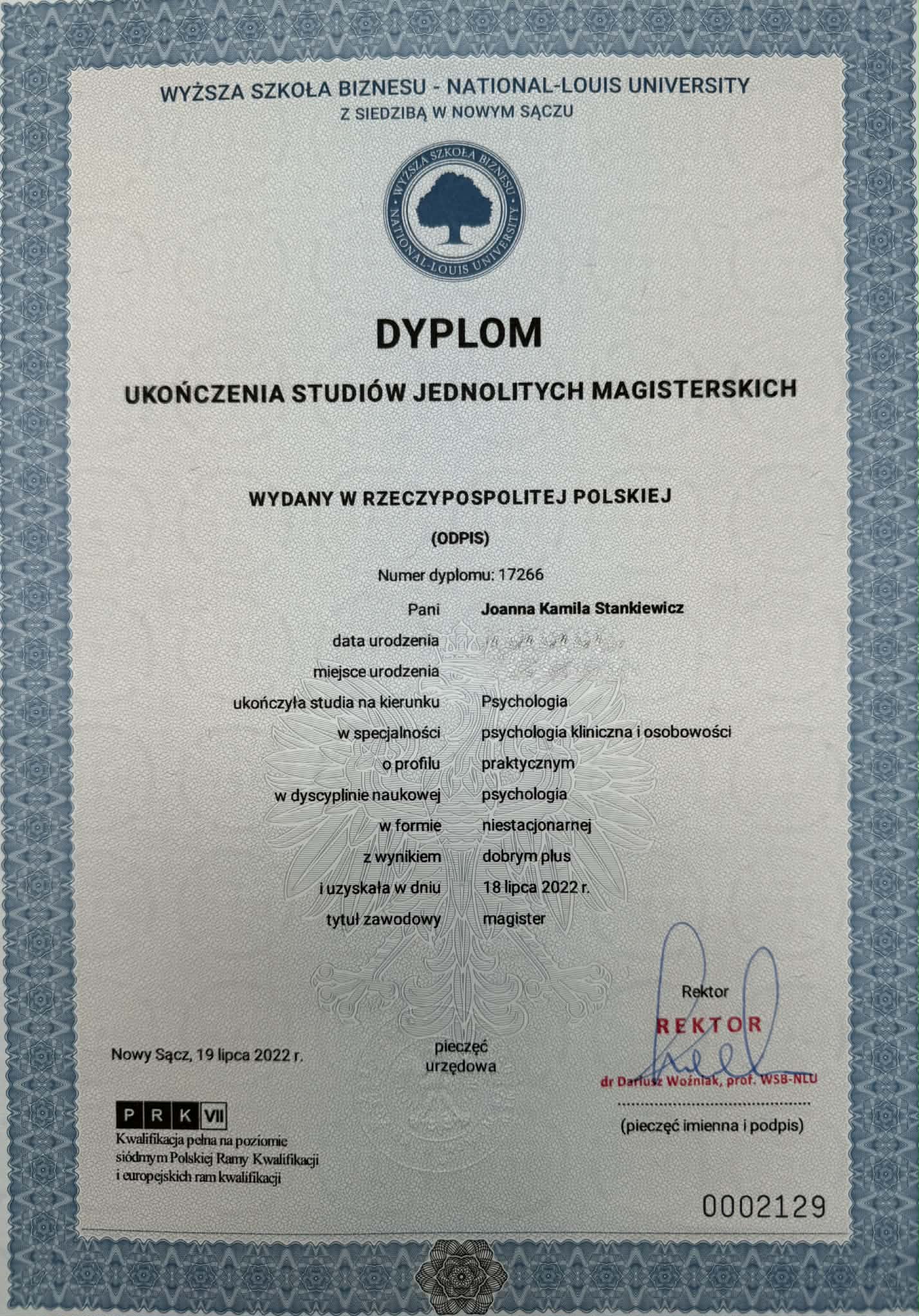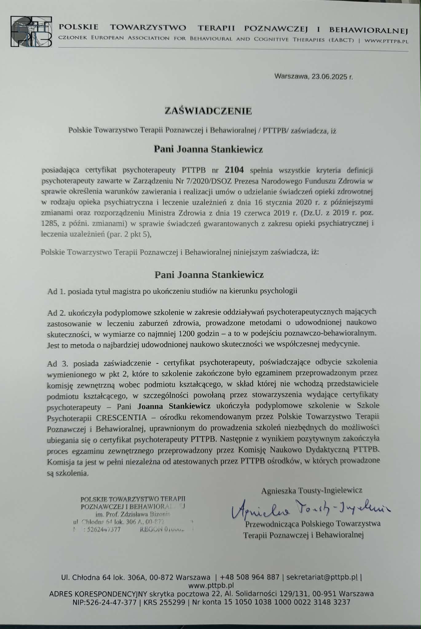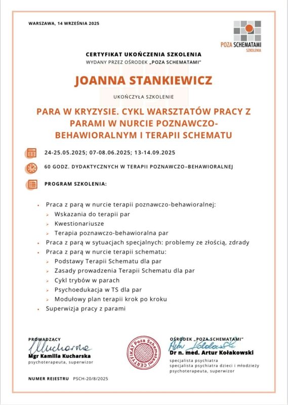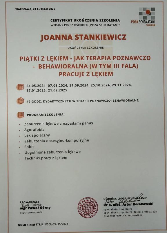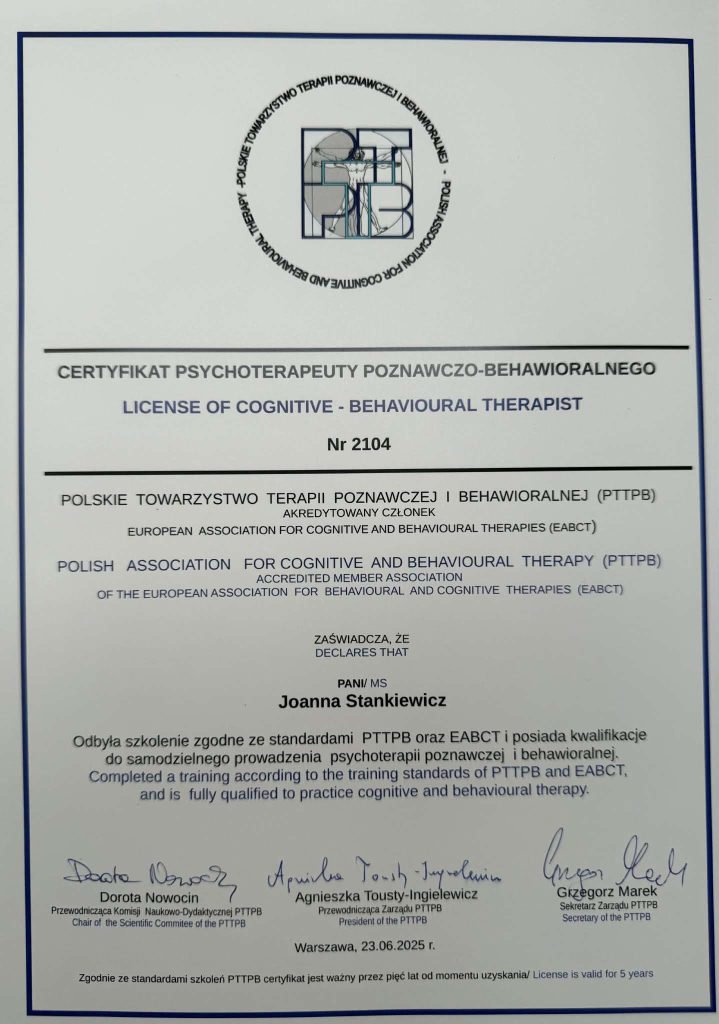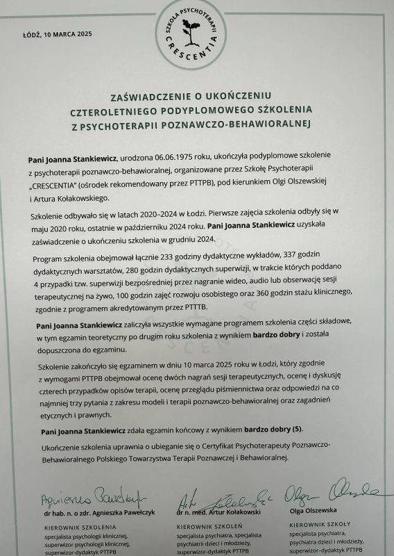 Jestem magistrem psychologii o specjalności psychologia kliniczna i osobowości, psychoterapeutką poznawczo-behawioralną (nr certyfikatu PTTPB – 2104), a także certyfikowaną terapeutką dzieci i młodzieży oraz rodzin. Jestem również członkiem Polskiego Towarzystwa Terapii Poznawczo-Behawioralnej oraz wykładowcą akademickim na wydziale psychologii w Wyższej Szkole Biznesu i Nauk o Zdrowiu w Łodzi.