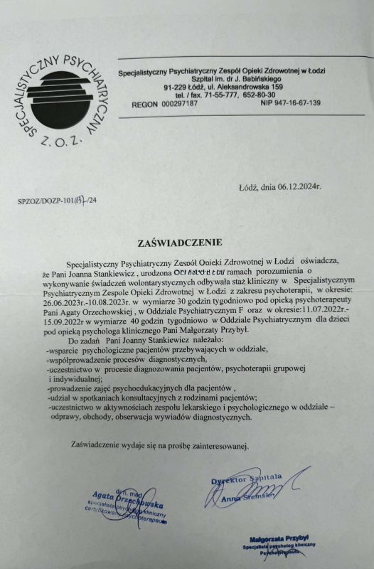 Odbyłam kilkumiesięczne staże kliniczne na oddziałach psychiatrii dziecięcej oraz dorosłych w Szpitalu im. J. Babińskiego w Łodzi.
